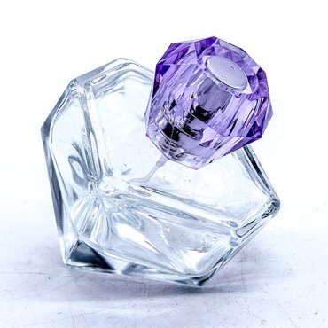Unique design crystal diamond shape perfume bottle,empty glass bottle for perfume use, with purple diamond shape pump spray cap.